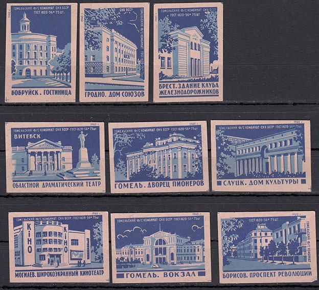 Набор спичечных этикеток. Города. 1960 год. Синие на розовой бумаге, 9 штук
