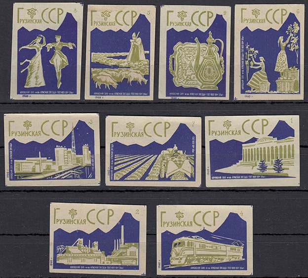 Набор спичечных этикеток. Грузинская ССР. 1960 год. Фиолетовые на серой бумаге. 8 штук!!!!