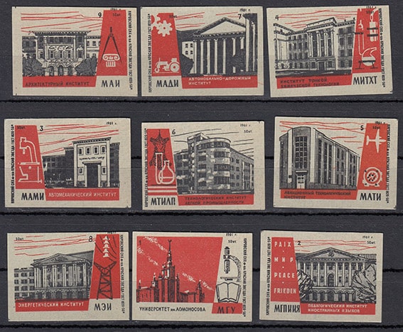 Набор спичечных этикеток. Институты, 1961 год, 9 штук, красные на серой бумаге