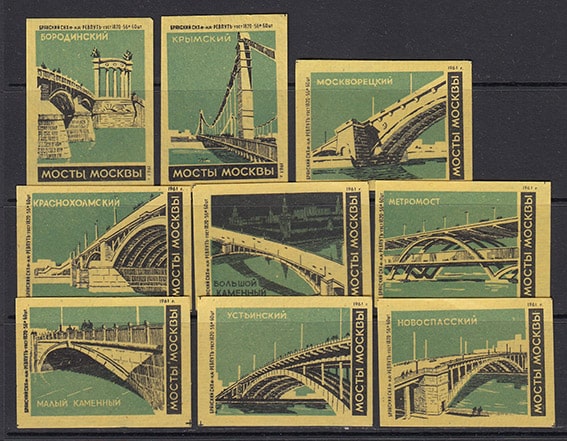 Набор спичечных этикеток. Мосты Москвы, 1961 год, бирюзовые на желтой бумаге, 9 штук