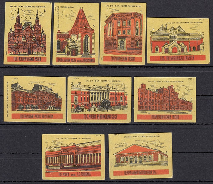 Набор спичечных этикеток. Музеи, 1961 год, оранжевые на желтой бумаге, 9 штук