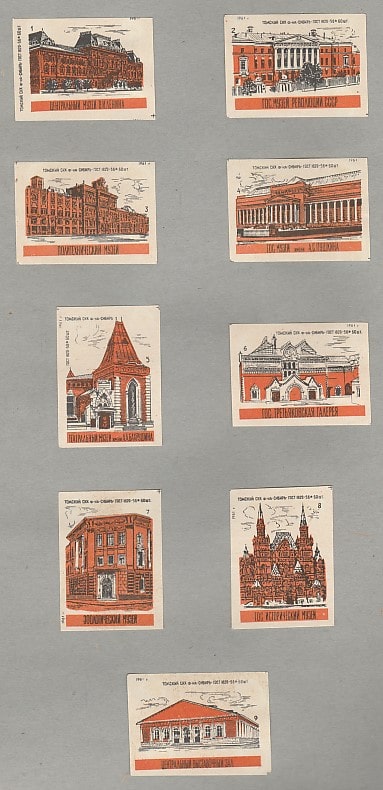Набор спичечных этикеток. Музеи Москвы (II), 1961 год. 9 штук Томский СНХ. Фабрика "Сибирь", (наклеены на лист 245/325 мм)