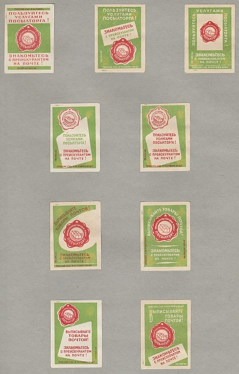 Набор спичечных этикеток. Пропаганда посылторга, 1959 год, 9 штук. Томский СНХ. Фабрика "Сибирь", (наклеены на лист 245/325 мм)