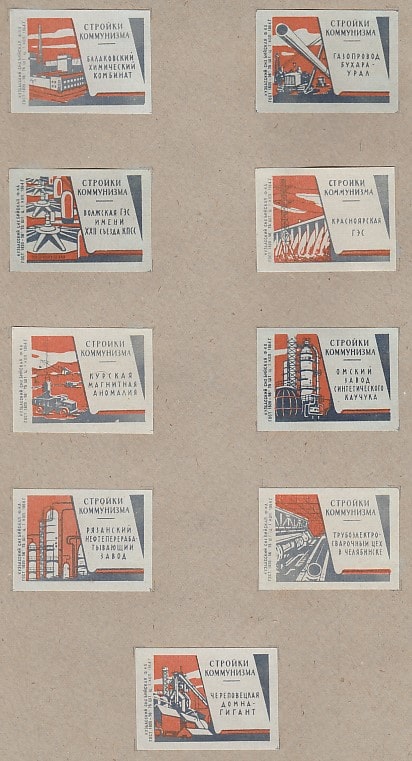 Набор спичечных этикеток. Стройки коммунизма, 1964 год, 9 штук.