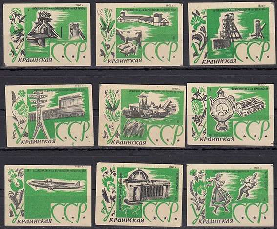 Набор спичечных этикеток. Украинская ССР, 1960 год, 9 штук, зеленые на белой бумаге