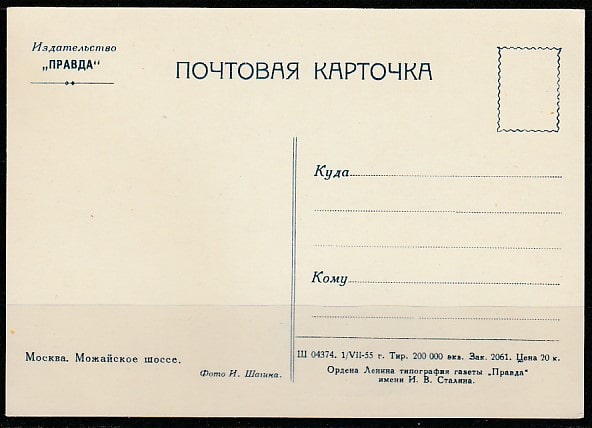 Немаркированная ПК 1955 год. Москва. Можайское шоссе.