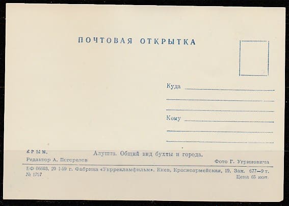 Немаркированная ПК. Крым. Алушта. Общий вид бухты и города, 20.01.1959 год.