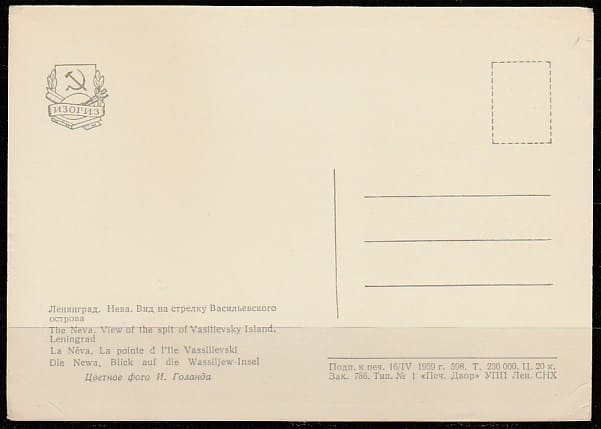 Немаркированная ПК. Ленинград. Нева. Вид на стрелку Васильевского острова, 16.04.1959 год, "ИЗОГИЗ".