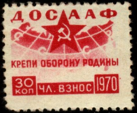 Непочтовая марка ДОСААФ 1970 год. Членский взнос 30 копеек (21 х 25 мм)