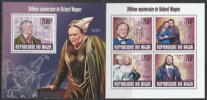 Нигер 2013 год. 200 лет со дня рождения немецкого композитора Рихарда Вагнера, малый лист + блок.