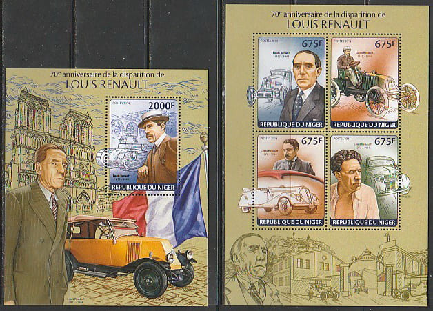 Нигер 2014 год. 70 лет со дня смерти французского промышленника, автогонщика Луи Рено, малый лист + блок.