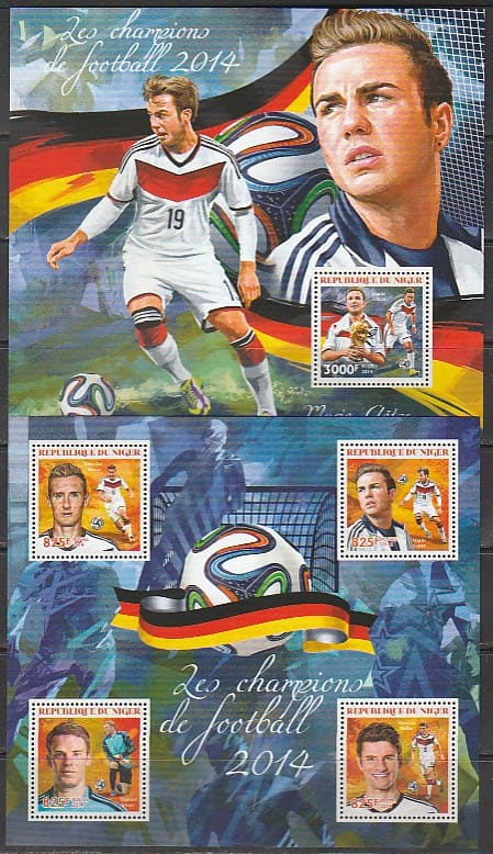 Нигер 2014 год. Чемпионат мира по футболу в Бразилии. Футболисты, малый лист + блок.
