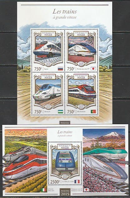 Нигер 2015 год. Высокоскоростные поезда разных стран, малый лист + блок.