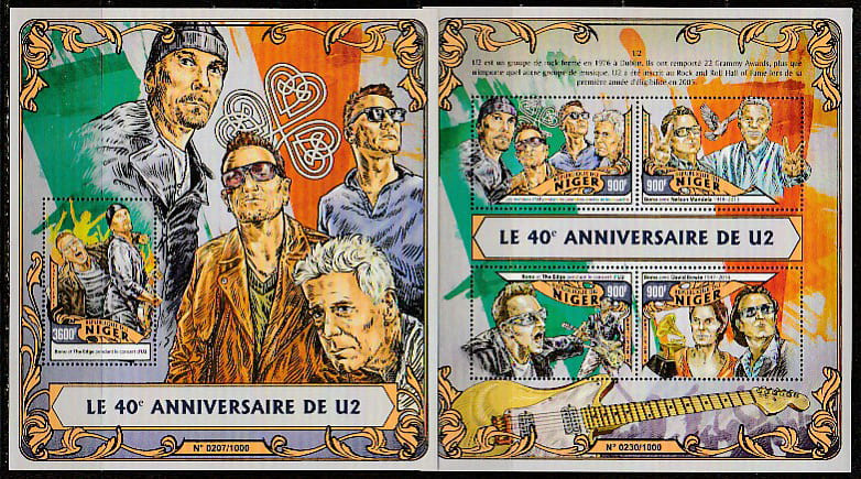 Нигер 2016 год. 40 лт рок-группе из Дублина U2, малый лист + блок.