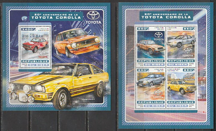 Нигер 2016 год. 50 лет выпуску японского автомобиля "Тойота Королла" первого поколения, малый лист + блок.