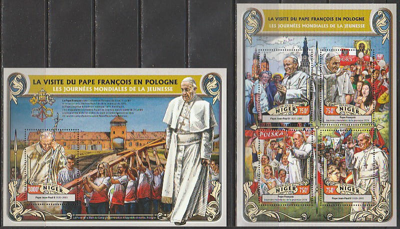 Нигер 2016 год. Визиты Папы Римского Франциска и Иоанна Павла II в Польшу, малый лист + блок.