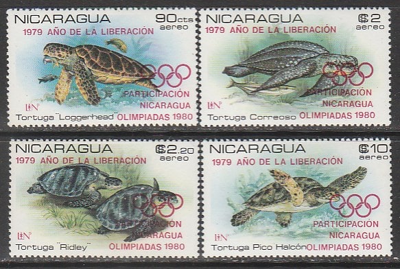 Никарагуа 1980 год. Участие Никарагуа в Московской Олимпиаде. Морские черепахи, НДП, 4 марки.