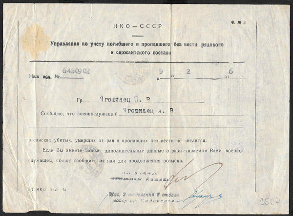 НКО СССР Управление по учету погибших и пропавших без вести рядового и сержантского состава, 9.2.1946 г.
