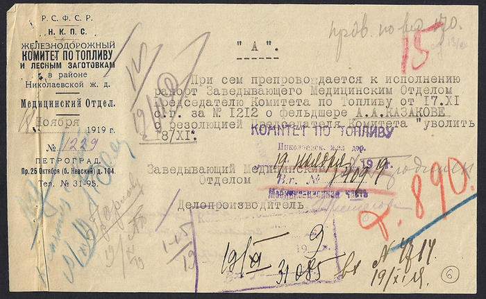 НКПС Железнодорожный комитет по топливу. Медицинский отдел. № 1229 от 18.11.19 г