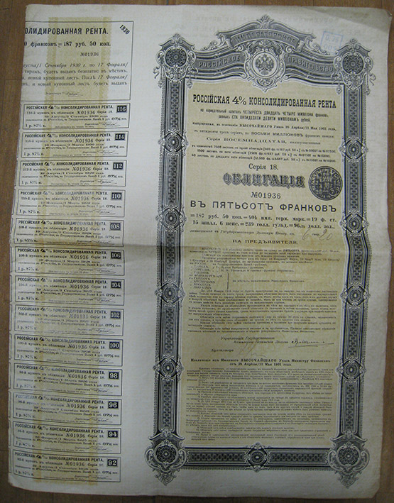 Облигация № 01936 в 500 франков. Российская 4% Консолидированная рентаОблигация № 01936 в 500 франков. Российская 4% Консолидированная рента
