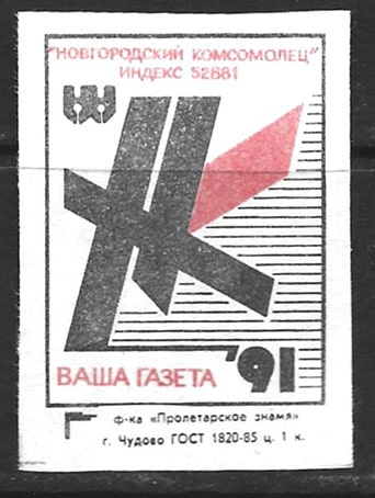 Одиночная спичечная этикетка. Газета "Новгородский комсомолец". "Пролетарское Знамя" 1991 год
