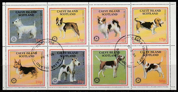 Остров Калв (Шотландия) 1984 год. Породы собак, 8 гашёных марок (непочтовые)