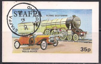 Остров Стаффа (Шотландия) 1972 год. Паровоз и автомобиль ретро. Гашеный блок