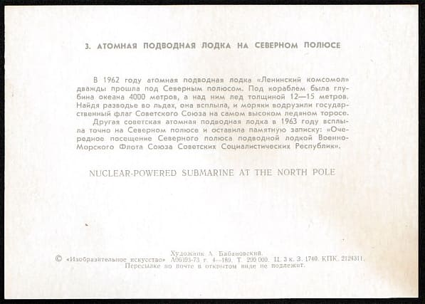 Открытка. Атомная подводная лодка на Северном полюсе, 1973 год.