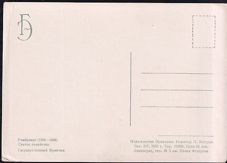 Открытка Эрмитаж. Рембрандт. Святое семейство. Выпуск 1958 год