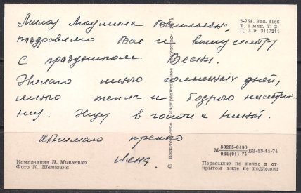 Открытка С праздником 8 марта! Выпуск 1974 год, подписана