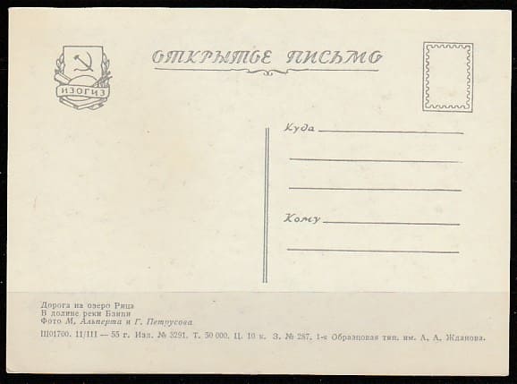 Открытое письмо. Дорога на озеро Рица. В долине реки Бзипи, 11.03.1955 год, "ИЗОГИЗ".