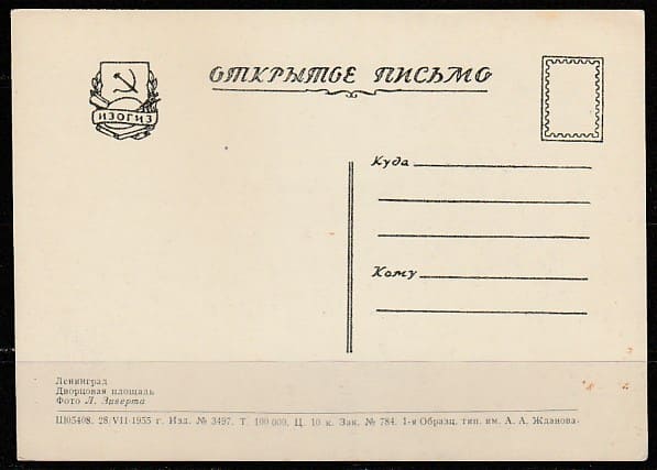 Открытое письмо. Ленинград. Дворцовая площадь, 28.07.1955 год, "ИЗОГИЗ".