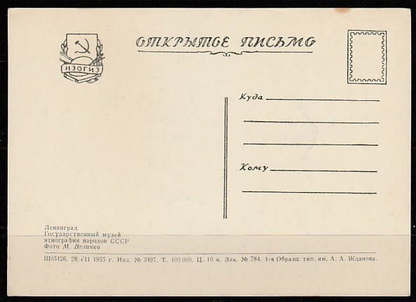 Открытое письмо. Ленинград. Государственный музей этнографии народов СССР, 28.07.1955 год, "ИЗОГИЗ".