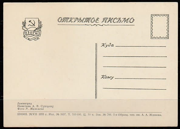 Открытое письмо. Ленинград. Памятник А.В. Суворову, 28.07.1955 год, "ИЗОГИЗ".