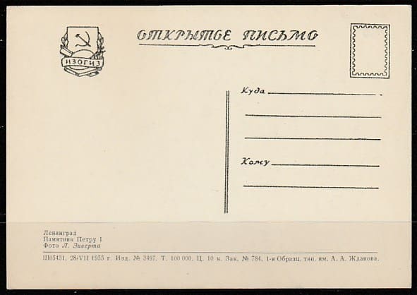 Открытое письмо. Ленинград. Памятник Петру I, 28.07.1955 год, "ИЗОГИЗ".