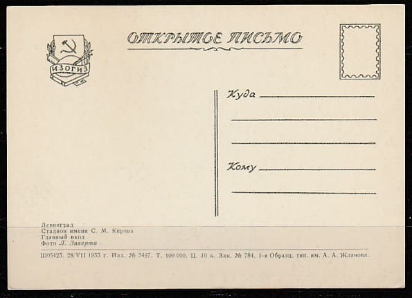 Открытое письмо. Ленинград. Стадион имени С.М. Кирова, 28.07.1955 год, "ИЗОГИЗ".