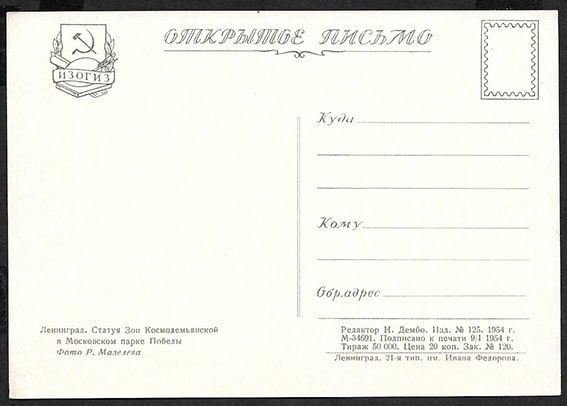 Открытое письмо. Ленинград. Статуя Зои Космодемьянской, 1954 год. ИЗОГИЗ