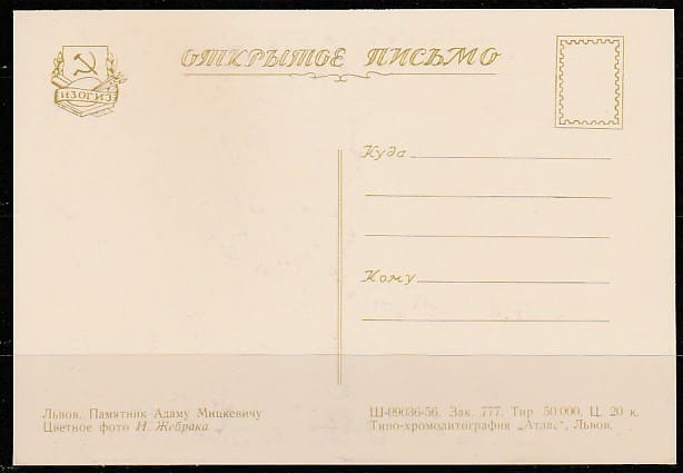 Открытое письмо. Львов. Памятник Адаму Мицкевичу, 1956 год, "ИЗОГИЗ".