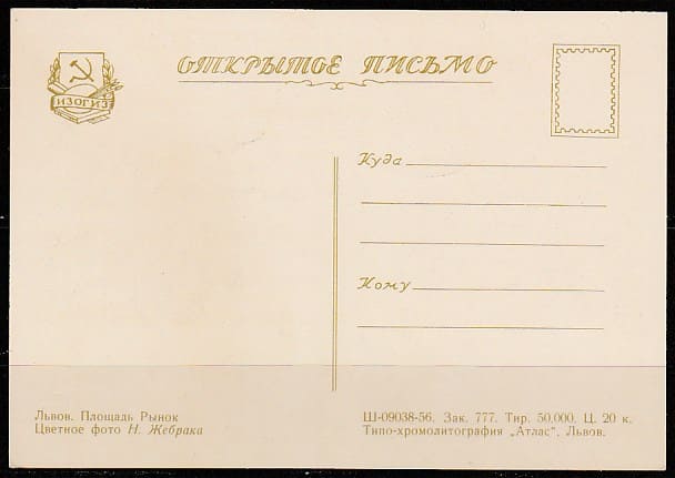 Открытое письмо. Львов. Площадь Рынок, 1956 год, "ИЗОГИЗ".