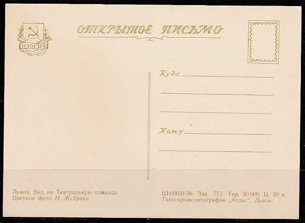 Открытое письмо. Львов. Вид на Театральную площадь, 1956 год, "ИЗОГИЗ".