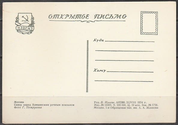 Открытое письмо. Москва. Сквер перед Химкинским речным вокзалом, 31.08.1954 год, "ИЗОГИЗ".