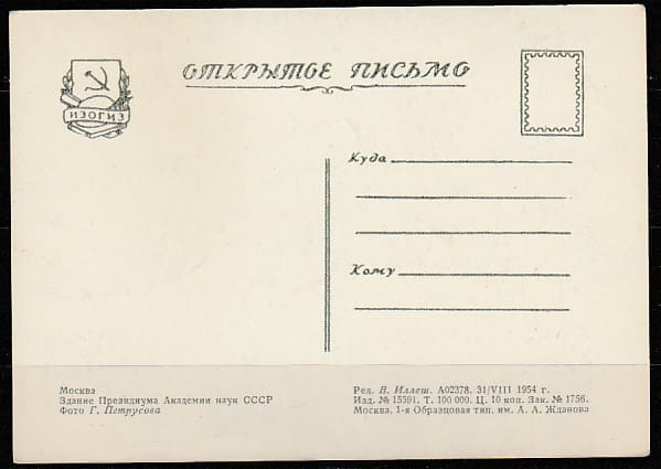 Открытое письмо. Москва. Здание Президиума Академии наук СССР, 31.08.1954 год, "ИЗОГИЗ".