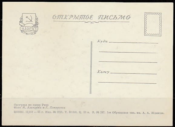 Открытое письмо. Прогулка по озеру Рица, 11.03.1955 год, "ИЗОГИЗ".