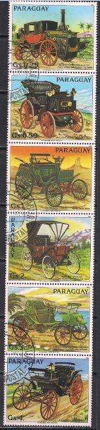 Парагвай 1983 год. Ретро автомобили. Неполная серия (сцепка из 6 гашеных марок)
