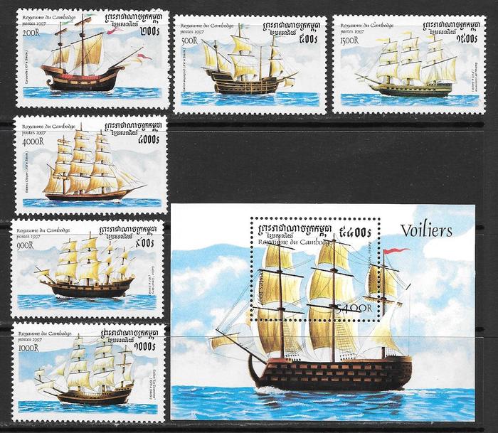Парусные корабли. Камбоджа 1997 год. Серия 6 марок и блок/м. н 200R
