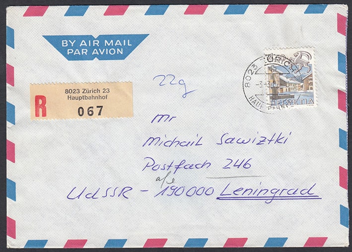 Письмо прошло почту Цюрих - Ленинград, 1987 год