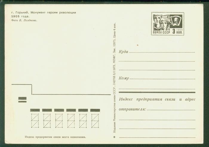 ПК г. Горький. Монумент героям революции 1905 г. Выпуск 03.01.73 г. № 2899