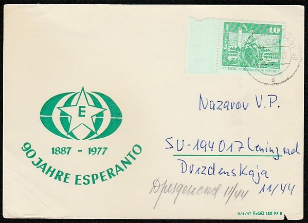 ПК ГДР. 90 лет эсперанто, 1977 год, п/почту.