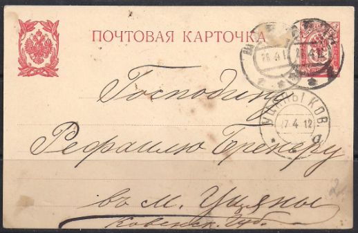 ПК Россия 1912 год, прошло почту, Россия - Утена (Ковенская губерния) (ю)