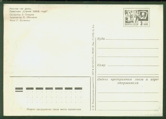 ПК Ростов-на-Дону. Памятник "Стачки 1902 года". Выпуск 22.08.77 г. № 5857